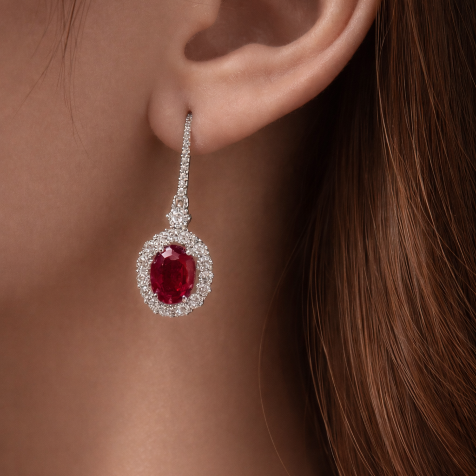 Diese edlen Ohrringe vereinen klare Geometrie mit luxuriöser Raffinesse. Im Zentrum steht ein tiefroter Hauptstein, der durch funkelnde weiße Akzentsteine perfekt in Szene gesetzt wird. Das kontrastreiche Farbspiel verleiht dem Design eine kraftvolle, zugleich elegante Ausstrahlung – modern, selbstbewusst und zeitlos.