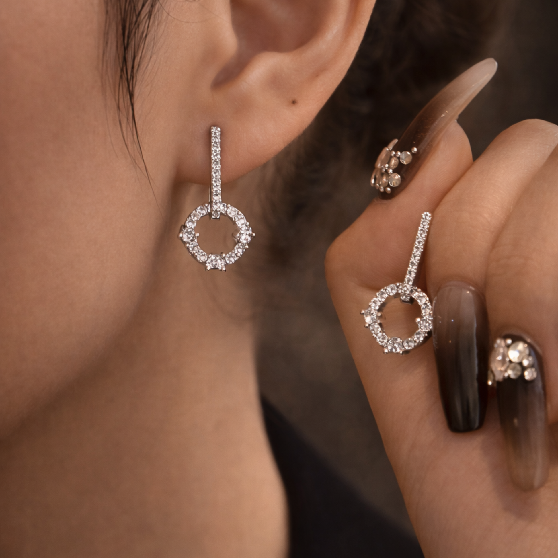 Diese eleganten Ohrringe verkörpern zeitgenössischen Luxus in seiner feinsten Form. Die geometrische Silhouette trifft auf ein funkelndes Ensemble aus Cubic Zirconia, das das Licht bei jeder Bewegung sanft reflektiert. Das offene Kreisdesign verleiht dem Schmuckstück Leichtigkeit und eine moderne Raffinesse – subtil, stilvoll und absolut zeitlos.